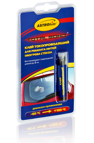 Токопроводящий клей ASTROhim предназначен для ремонта нитей обогрева заднего стекла автомобиля с повреждениями (разрывами) не более 2 см.