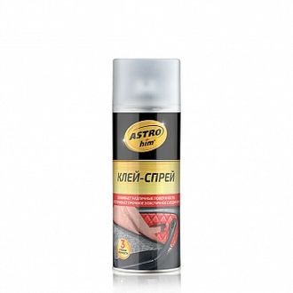 ASTROhim Клей-спрей - высококачественный аэрозольный клей для склеивания между собой в любых комбинациях тканных, нетканых, в том числе пористых материалов (натуральной и искусственной кожи, тканей, войлока, картона, бумаги, резины, поролона, минеральной ваты и др.), дерева, пластиков, а также приклеивания их на твердые несущие поверхности из пластика, металла, дерева, стекла и проч. Может использоваться в ремонте сидений и обивки салона, для оклейки корпусов сабвуферов и музыкальных полок, для приклеивания элементов отделки в автомобиле, при монтаже шумо- и теплоизоляции.