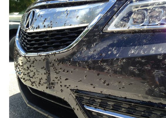Разбиваясь о стекло, бампер и кожухи зеркал автомобиля, останки насекомых формируют трудноудаляемый налет.